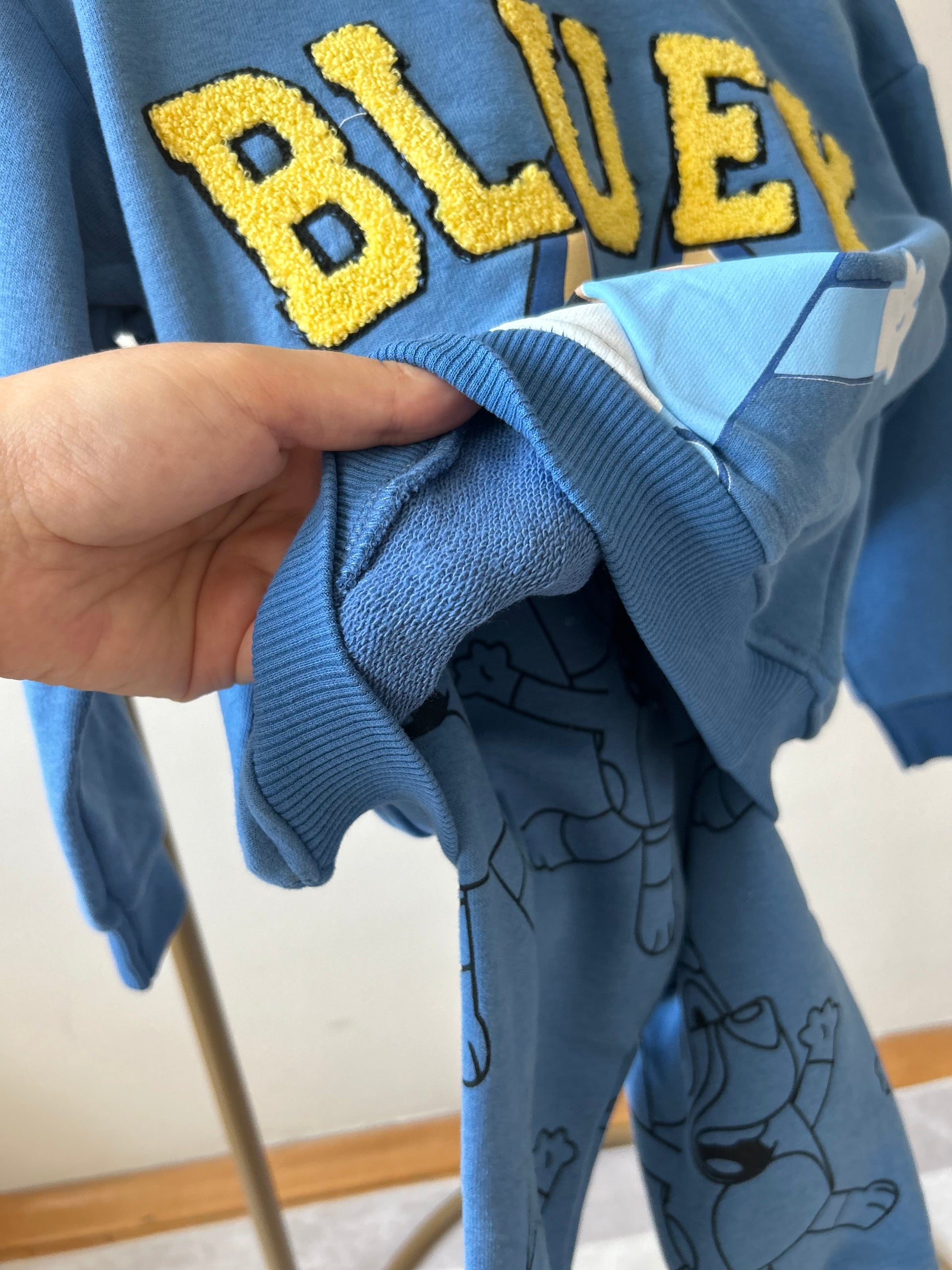 - Üst: Bluey baskılı, punch işlemeli detay