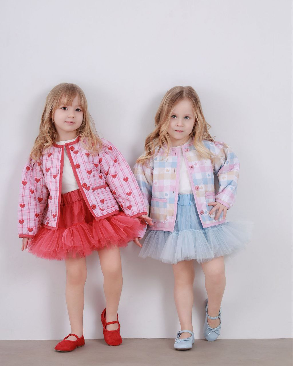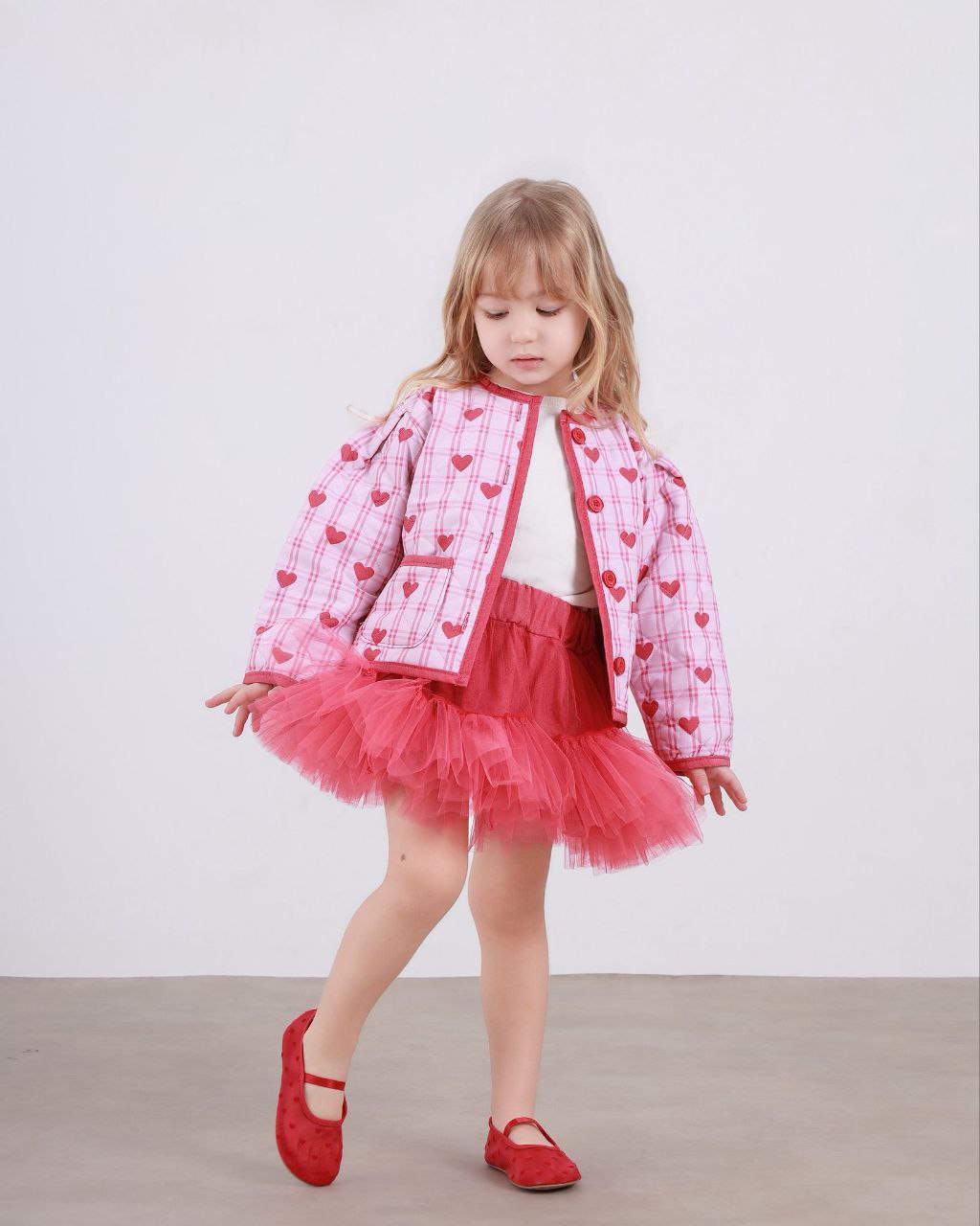 Kalpli kapitone ceket ve tütü etekten oluşan bu şık takım, miniklerin hem günlük kullanımda hem de özel günlerde rahatlıkla tercih edebileceği zarif bir kombin sunar. Yumuşak dokulu kapitone ceketi ve kabarık tütü eteği ile hem konforlu hem de göz alıcı bir görünüm sağlar. Kalp desenli modern tasarımı sayesinde çocukların severek giyeceği bir modeldir.