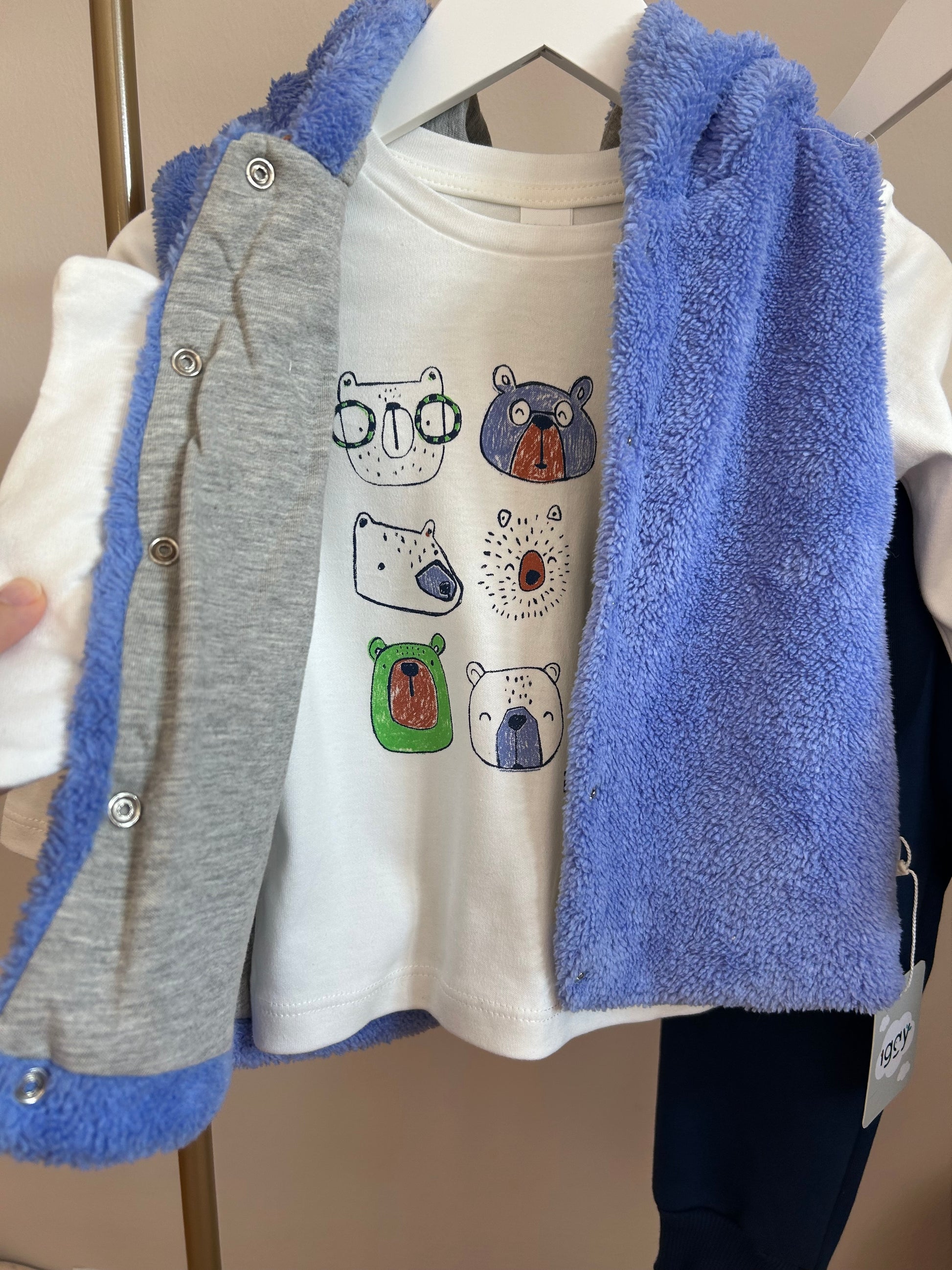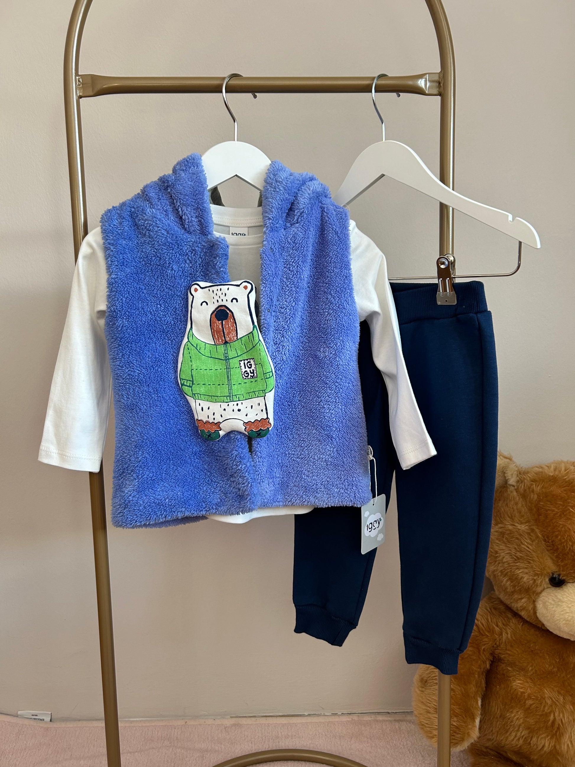 Mavi peluş yelekli takım